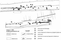2. Sectorul de locuire de pe terasa estică a aşezării. Pe latura sudică a fost săpată Sp. 4/2001 pentru a urmări situaţia stratigrafică şi materialele din zona cea mai intens locuită a aşezării. În Sp. 4/2001 cercetările au adus rezultate asemănătoare cu cele cunoscute în campaniile precedente. Chiar deasupra pământului steril din punct de vedere arheologic s-a constatat din nou un nivel subţire (0,1/0,15 m) conţinând ceramică din epoca bronzului (cultura Coţofeni). El este suprapus de o depunere bogată în resturi foarte fragmentare de olărie getică, atribuibile Latene-ului vechi. La rândul său această depunere este acoperită de un nivel conţinând materiale caracteristice Latene-ului recent. Poate fi remarcat că şi pe profilele Sp. 4/2001 au fost sesizate, atât în poziţie oblică sau verticală, cât şi orizontală resturi provenite de la pari, care, destul de probabil, făceau parte din structura construcţiilor din acest sector. Din păcate construcţiile ca atare nu s-au păstrat, cu excepţia, poate, a uneia de la care au rămas resturi discontinue de la lutuiala podelei.