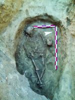 Au fost descoperite două morminte (fig. 18): M 1 - incineraţie (bustum), orientat NNV – SSE. Şanţul de tiraj (dimensiunile: L. 1,88 m; La. 0,50–0,62 m) s-a conturat la -0,70 m, adâncimea maximă a complexului fiind de 1,05 m. Groapa mormântului, al cărei contur nu a putut fi precizat, a fost săpată în vegetalul antic, iar şanţul de tiraj, în loess. Nu s-au descoperit elemente de inventar funerar. M 2 - înhumaţie în groapă simplă (fig. 19), cu sicriu, dimensiuni: L. 3,00 m; La. 1,75 m, conturat la – 1,70 m, adâncimea maximă -2,65 m. Defunctul, depus în decubitus dorsal, cu mâinile pe bazin, era orientat E (capul) – V. Inventarul funerar, descoperit în afara sicriului, includea un opaiţ, două vase de sticlă (unul complet dezagregat, nedeterminabil din punct de vedere tipologic, celălalt, un pahar cu corp cilindric, larg, cu gura evazată, aflat într-o stare de conservare precară) şi câteva zeci de ţinte de fier de la încălţăminte. Pe baza opaiţului (tipul Iconomu XX), mormântul poate fi datat în sec. II – III p. Chr.