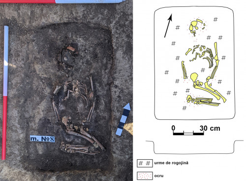 M8/2021 (mormântul principal, Yamnaya, faza timpurie) a fost descoperit la 5,20 m SSE de RC și la -1,40 m adâncime, având o groapă rectangulară, cu axul logitudinal N-S și dimensiunile de 1,10 × 0,70 m, -0,10 m adâncime, de la nivelul de identificare, acoperită de prima manta (fig. 12). Pe rogojina putrezită de pe fundul gropii, era depus scheletul, cu craniul pe care se păstrau urme de ocru orientat spre NNV, chircit, în decubit dorsal, cu brațele ușor îndoite pe lângă trunchi și cu genunchii ridicați, căzuți spre stânga, fără alt inventar funerar.
