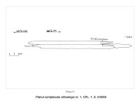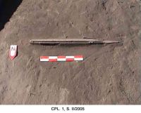 În baza unor informaţii mai vechi obţinute de la localnici, cum că în perimetrul cercetat de noi, cu ani în urmă, s-a mai descoperit întâmplător un mormânt de inhumaţie, compus dintr-un „sarcofag” improvizat din ţigle şi olane romane, a mai fost deschisă o secţiune, SII/2005, la aprox. 430 m E de fostul pichet de grăniceri de la Desa şi la 170 m V de SI/2005. Secţiunea a avut o lungime de 31,5 m, cu o lăţime variabilă de la 1,5 m la 3 m şi a avut rolul de a taluza malul înalt al Dunării într-o zonă în care se mai observă marginea nordică a aceluiaşi grind de nisip pe care se afla şi aşezarea romană. În toată secţiunea a apărut un strat de nisip eolian cu o grosime medie de 1 m, începând de la nivelul vegetal, situaţie observabilă numai pe profilul nordic. La aprox. 1,15 m adâncime a apărut un complex funerar, pe care l-am numerotat cu M1, format din mai multe fragmente ceramice romane aparţinând unor vase sparte pe loc din vechime. Printre aceste fragmente ceramice au fost găsite oase umane incinerate împrăştiate în toată zona complexului; nu a fost surprins, nici în profil, nici în plan, conturul vreunei gropi, solul fiind omogen din punctul de vedere al compoziţiei. O parte din materialul arheologic al acestui complex a fost deranjat de galerii de animale. La aprox. 0,65 m, spre E de M1, la acelaşi nivel, a fost găsit un fragment de cărămidă romană. În zona lui M1 au mai fost descoperite câteva ţinte din fier provenite de la sandale romane. Tot în secţiunea SII/2005, la aprox. 2,5 m spre NV de M1 şi la adâncimea de 1,22 m, a apărut un complex, numerotat de noi cu cpl. 1, format din două spade, un prinzător de teacă, un vârf de lance, un altul de suliţă şi un mâner fragmentar de la un pumnal. După dispunerea pieselor, se pare că mai întâi a fost depus mânerul pumnalului4 după care a fost aşezată spada mare – lungă de 0,97 m – cu vârful spre VNV; mânerul de pumnal a fost depus cu partea dinspre lama lipsă, la E. Spada mare a fost descoperită cu tăişul dinspre N, uşor ridicat5. A doua spadă din acelaşi complex, numită de noi cea mică6 – lungă de 0,90 m – a fost depusă cu vârful lângă mânerul spadei mari, peste tăişul sudic al acesteia dar şi peste mânerul pumnalului; de fapt mânerul acestei spade suprapune mânerul pumnalului. La capătul dinspre V al celor două spade a fost găsit un vârf de lance depus cu tubul de înmănuşare spre E peste vârful spadei mari şi mânerul spadei mici. La S de piesele menţionate, tot în acelaşi complex, a fost descoperit un vârf de suliţă orientat aprox. E-V, cu tubul de înmănuşare spre E. Acesta a fost depus la 1,5 cm de lama spadei mici, practic în dreptul lamei şi mânerului acesteia. Pe lama spadei mici, aproape de mâner, a fost descoperit prinzătorul de teacă. Toate piesele din complex sunt din fier cu excepţia prinzătorului de teacă care este din bronz. Nici în cazul acestui complex nu a fost surprins conturul vreunei gropi.