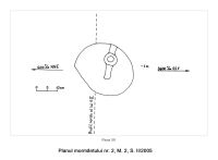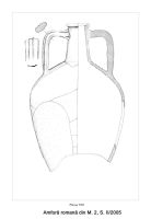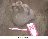 Tot în SII/2005, la aprox. 11 m spre NE de M3, în profilul nordic, şi la o adâncime de 1 m, a fost descoperit un alt mormânt, de astă dată de inhumaţie, numerotat de noi cu M2. Mai întâi a apărut o amforă romană8 uşor înclinată spre SE. Sub amforă, au fost găsite câteva fragmente de oase de la un foetus uman. Nici în acest caz nu a fost surprins conturul gropii.