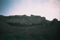 - Între cele două ziduri, în aşa-zisul "turn". În partea superioară au fost degajaţi bolovani mari din calcar, cu resturi de mortar pe suprafaţa lor, unii ciopliţi sumar, numai pe o parte, provenind de la ultima fază de refacere şi utilizare a incintei de V. S-a adâncit secţiunea până la –3 m. Tot pământul interior este amestecat cu resturi ceramice din perioade diferite: romane, romano-bizantine şi feudal-timpurii (resturi de vase "Dridu"), iar profilul obţinut indică o nivelare masivă. Zidul care se orientează spre NV are o grosime de 1,1 m şi o înălţime actuală de la 1,15 m spre capătul sudic până la 0,45–0,5 m spre nordul secţiunii, unde a fost puternic demantelat. În exterior s-a putut măsura foarte bine înălţimea, deoarece aici au avut loc fenomene de eroziune, zidul fiind desfăcut probabil în 1943, când Grigore Florescu a scos la zi toată incinta de V. Din acest motiv a fost dezvelit în unele porţiuni, la bază, astfel încât aici înălţimea maximă urcă la 1,8–1,9 m. Şi pe o parte şi pe cealaltă zidul prezintă mai multe tehnici de construcţie: acolo unde a fost demantelat puternic se mai păstrează nucleul unui emplecton din piatră mică cu mortar din nisip şi var, cu aspect închis. În emplecton se văd, în anumite locuri, bulgări de mortar din nisip, var şi fragmente de cărămidă pisată, care vin din altă parte. Apoi urmează o fază de construcţie din piatră de talie mică şi medie, peste care se aşează pietre de talie mare, cu dimensiunile de 0,75x0,48x0,4 m; 0,94x0,5x0,29 m; 0,5x0,65x0,33 m; 0,78x0,55x0,3 m; 0,74x0,42x0,35 m. Pe alocuri, între rosturile pietrelor mari, mortarul este gălbui, nisipos, cu rezistenţă scăzută. Dinspre V, acest zid, care a stat vreme de mai bine de o jumătate de sec. la vedere, are următoarele caracteristici: la bază, acolo unde pământul a fost spălat, emplectonul este din piatră mică cu mortar, aşezat peste un pământ de culoare închisă, cu resturi de cultură "Dridu" în compoziţie; urmează o fază a zidului propriu-zis, din care se mai păstrează trei asize din piatră şi cărămidă, executate destul de neglijent, cu puţin material între rosturi. Piatra este de talie diferită, cea mai mare cu lungimea de 0,30–0,22 m, iar cărămida subţire de 0,05–0,08 m. La rosturi s-a utilizat, în unele cazuri, cărămidă ori piatră aşezate vertical. În partea superioară care se păstrează au fost aşezate blocuri mari de calcar, de formă paralelipipedică, cu dimensiuni asemănătoare celor de pe partea interioară: 0,75x0,5x0,3 m; 0,6x0,4x0,32 m; 0,57x0,2x0,24 m; 0,5x0,4x0,32 m; 0,6x0,15x0,22 m. La adâncimea de 3 m a fost identificat un nivel de mortar, care se întinde pe toată distanţa dintre cele două ziduri. Acesta conţine şi piatră de talie mică, resturi arheologice amestecate din toate epocile atestate. Nu este exclus ca să fie nivelul de construcţie al zidului exterior. Urmărind traseul zidului, care ne aşteptam să se închidă în ultima incintă, am constatat că lipsa paramentului care se observă din afară, nu se datorează schimbării traseului, cum am crezut, ci demantelării. Aici paramentul a fost degajat, zidul demantelat, aşa că se păstrează pe grosimea de 0,74–0,75 m şi îşi continuă traseul spre NV unde-l vom găsi în SIIA.