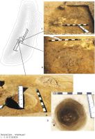 2. Pandantiv/aplică realizat(ă) pe fragment de valvă a scoicii Spondylus gaederopus. Piesa are indicativul (provizoriu) INP-II 2 şi este aproape întreagă; lipsesc mici porţiuni ale marginii drepte, fracturate în vechime. Ea aparţine tipurilor III B5/III E4 din lista tipologică a industriei preistorice a materiilor dure animale recent elaborate5. Starea sa de conservare este bună; pe faţa superioară se observă urmele aderente ale fragmentului de perete prăbuşit (lut amestecat cu materii vegetale – paie tocate) pe care a fost descoperit artefactul. Materia primă o constituie valva superioară a scoicii de origine mediteraneană Spondylus gaederopus. Este vorba de o piesă rară între descoperirile din aria culturii Gumelniţa de la nordul Dunării, valoroasă ca însemn de prestigiu şi având rol simbolic/magic bine marcat, conferit de scoica utilizată ca materie primă. Nu putem face precizări legate de fabricarea locală sau de provenienţa din sudul Peninsulei Balcanice a unor astfel de obiecte. Faptul că ele se produceau curent în ateliere specializate este deja binecunoscut, astfel că nu excludem provenienţa sa sudică. Artefactul are formă generală ovală neregulată, cu faţa superioară convexă şi faţa inferioară concavă (morfologia anatomică modificată prin fasonare). Marginile sunt rotunjite prin fasonare şi datorită uzurii funcţionale; pe un segment al părţii distale/faţa inferioară se conservă parţial porţiunea de îmbinare a valvelor, având morfologie specifică. Piesa are un număr de şapte perforaţii, dintre care cinci întregi (funcţionale) şi două fracturate în vechime (se păstrează cca. 1/2 din circumferinţă). Se ilustrează astfel uzajul îndelungat (pe parcursul mai multor generaţii?) prin fracturarea accidentală la nivelul perforaţiilor (care serveau ca dispozitive de suspendare sau de fixare prin coasere) şi repararea prin practicarea a noi perforaţii. La partea proximală se află două perforaţii, plasate excentric spre marginea dreaptă; una dintre ele este fracturată (1) şi alta întreagă (2), executată într-o etapă ulterioară de folosire; ele au formă circulară în plan şi bitronconică asimetrică în profil. Pe marginea dreaptă, de contur sinuos (de debitaj) se păstrează trei perforaţii întregi (3-4, 6); lângă ultima dintre ele se observă urmele unei perforaţii executate anterior, fracturate (5); aceste perforaţii au profil tronconic sau bitronconic asimetric. Perforaţia de la partea distală (7), de mari dimensiuni, este plasată excentric spre marginea dreaptă, are formă uşor ovală asimetrică în plan şi bitronconică asimetrică în profil; pe faţa superioară, marginile sale sunt plane, pe o lăţime de cca. 3-5 mm; după toate indiciile este vorba de urmele finisării prin abraziune a suprafeţei, după executarea perforaţiei respective. Etapa debitajului a fost marcată, probabil, de fracturarea prin percuţie directă a marginii drepte a valvei superioare a scoicii, care păstrează un contur sinuos. Fasonarea valvei este quasi-integrală şi a fost executată prin abraziune multidirecţională intensă, urmărindu-se obţinerea suprafeţelor netede şi a marginilor rotunjite. Diametrul iniţial al artefactului pare a fi fost mai mare, acesta fiind redus prin fracturarea accidentală a marginii drepte. Finisarea prin abraziune fină pe substrat mobil flexibil (cu ajutorul unei bucăţi de material textil sau de piele) a înlăturat urmele abraziunii (striurile dense, adânci, în fascicule), lustruind suprafeţele şi conferindu-le un aspect lis uniform. Perforaţiile s-au practicat în mai multe etape, ilustrând momente succesive de deteriorare şi reparare, consecinţă a unui uzaj îndelungat. Perforarea s-a realizat unilateral sau bilateral prin rotaţie continuă (rapidă) cu ajutorul sfredelului. Într-un singur caz (perforaţia distală, 7) s-a procedat la finisarea marginilor perforaţiei. Urmele de utilizare observabile pe artefactul analizat se concretizează în: tocirea şi lustruirea suprafeţei superioare şi a marginilor, pe care constatăm prezenţa striurilor fine, rare, dispuse de manieră aleatorie; tocirea difuză, superficială a marginilor perforaţiilor laterale şi a perforaţiei distale; tocirea intensă, preferenţială (pe anumite sectoare ale circumferinţei), a marginilor perforaţiilor proximale; este vorba de jumătatea superioară a perforaţiei întregi şi jumătatea inferioară a perforaţiei mai vechi, fracturate. Aşa cum deja s-a subliniat, perforaţiile au fost realizate în mai multe etape, ilustrând momente succesive de deteriorare şi reparare, consecinţă a unei folosiri îndelungate. Se poate contura, în mod preliminar şi ipotetic, următoarea succesiune a etapelor de fabricare/utilizare şi, implicit, a rolului funcţional al acestui obiect de podoabă: debitajul şi fasonarea/finisarea integrală; realizarea a trei perforaţii (1, 3, 5) cu rol de fixare prin coasere a piesei şi a unei perforaţii nefuncţionale (7), cu rol estetic; piesa avea rolul de aplică (fixată prin coasere pe suporturi textile sau de piele); fracturarea accidentală succesivă a perforaţiilor 1 şi 5; repararea prin practicarea perforaţiilor 2, 4, 6; utilizarea piesei ca aplică; utilizarea piesei ca pandantiv de tip lung, fixat pe firul de suspendare prin intermediul perforaţiei proximale (2), care prezintă urme intense de tocire, specifice suspendării libere şi îndelungate pe fir (de origine vegetală sau animală – piele, lână); astfel se pot explica urmele de utilizare bine marcate de la nivelul acestei perforaţii, care nu apar, de regulă, în cazul aplicelor cusute. Se pot viza şi alte variante de utilizare, precum folosirea piesei ca pandantiv, perforaţia proximală şi cea distală servind pentru fixarea axială pe fir, iar cele de pe marginea dreaptă pentru atârnarea unor fibre împletite, canafi, alte pandantive 