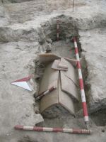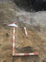 Concomitent cu analizarea acestor complexe funerare, în suprafaţa S16 cercetarea arheologică întreprinsă în nivelul de pământ galben şi în nivelul de dărâmătură cu mortar (în care au fost descoperite un număr de 8 monede din bronz) a dus la descoperirea mai multor situaţii aheologice care vor fi prezentate în continuare de la N la S. În caroul 1, la adâncimea de -0,76 m a fost descoperită o groapă de mici dimensiuni (Fig. 25), care a fost secţionată pe jumătate şi în care au fost descoperite fragmente ceramice de la cel puţin două vase. Din păcate însă cercetarea acestui complex nu a fost finalizată, urmând ca aceasta să se încheie în campania următoare. În caroul 2 al S16 la adâncimea de -0,63 m a fost descoperită o zonă cu dărâmătură din piatră de şist verde cu mortar (Fig. 26, 27) iar la adâncimea de -0,85 m şi la S de aceasta, o altă zonă cu dărâmătură din cărămidă şi olane (Fig. 28, 29), sub aceasta din urmă fiind nivelul de dărâmătură din olane a edificiului roman timpuriu cu zone de arsură (Fig. 30, 31) (în interiorul edificiului şi în afara lui), pe care ne-am oprit în această campanie. Tot în acest carou la adâncimea de -1,22 m am identificat în integralitatea sa un mormânt cu amenajare din ţigle de acoperiş dispuse în dublă pasntă peste groapă (Fig. 32), descoperit în anul 2012, care după dimensiuni este de sub-adult şi care urmează să fie cercetat în campania următoare. În caroul 3 al S16 la adâncimea de -0,85 m am mai descoperit o groapă de formă ovală (dimensiuni maxime 1,00 x 0,60 m) care s-a profilat foarte bine în nivelul de mortar şi care iniţial a fost interpretată ca un mormânt de inhumaţie (Fig. 33, 34). În momentul săpării ei însă am ajuns la concluzia că nu avem de-a face cu un complex funerar aşa cum am crezut iniţial, ci cu o simplă groapă, probabil menajeră sau de altă natură, idee susţinută în parte de umplutura acestei gropi şi de forma ei prea ovală în comparaţie cu gropile tipice de morminte de inhumaţie cunoscute până acum.
