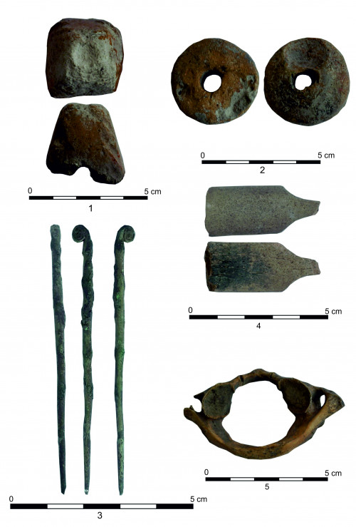 Asociat cu materialele ceramice fragmentare atribuite epocii bronzului mijlociu (Cultura Wietenberg), au fost descoperite câteva obiecte care pot fi încadrate acestei perioade, dintre acestea remarcăm: un fragment de la o greutate de lut de formă trunchi-piramidală, prevăzută cu perforație tranversală în partea superioară și cu o alveolă circulară în partea superioară a piesei (fig. 7/ 1); o fusaiolă întreagă, lucrată din lut ars, perofată axial, ușor plată și marginile rotunjite (fig. 7/ 2) și un fragment de ac de os cu corpul în formă de „vâslă”, păstrat fragmentar, care prezintă urme intense de utilizare (fig. 7/ 4). Vârful piesei este rupt din vechime.