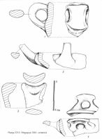 a) un vas de dimensiuni mijlocii, descoperit în caseta C. 2, ornamentat cu triunghiuri, linii incizate şi linii în zigzag. Vasul este de culoare neagră-cenuşie, bombat în zona mediană, are gâtul aproape cilindric, prezentând şi o toartă de mici dimensiuni;