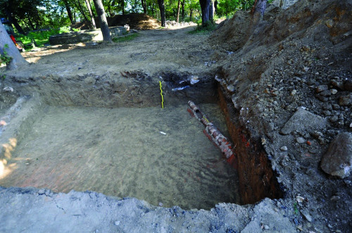 Secțiunea S8, de formă dreptunghiulară, cu dimensiunile de 14x4 m, a fost amplasată pe latura de vest a corpului principal al domeniului. Din profilul de nord, la circa 0,90 m de profilul de est și la o adâncime de -1,00 față de nivelul actual de călcare a apărut un sistem de aducțiune de apă din tuburi ceramice care intră în profilul de est al secțiunii (A1) (FIG. 5). Această tubulatură este formată din componente ceramice cu dimensiunile de 0,27 de m partea activă și 0,03 m partea de îmbinare (deci 0,30 m lungime) și un diametru de 0,15 m. Sunt prinse între ele cu un mortar de var destul de solid. În dreptul caroului doi, respectiv la circa 4,40 m de profilul de vest, poziționat nu neapărat paralel față de primul sistem de aducțiune, a apărut un al doilea astfel de sistem de aducțiune de apă (A2). Interesant de semnalat este că acesta apare la o adâncime mai mică, respectiv la -0,75 m și pare a nu fi construit în același timp cu A1. Mai mult, dimensiunile tuburilor sunt diferite, iar ca tehnică de construcție aceste tuburi sunt așezate pe un pat de cărămidă și sunt flancate, de asemenea, de alte cărămizi prinse cu mortar.