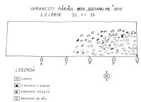 În C4 la –1,12 m a fost găsit un fragment ceramic cu buza evazată sub care sunt incizate romburi dispuse pe orizontal într-un şir, fragmentul este din pastă semigrosieră de culoare roşie. În C5 la –1,28 m din aceeaşi secţiune S2 au fost depistate un fragment ceramic de culoare cenuşie cu buza dreaptă sub care se află un ornament şnuruit şi baza plată de la un vas de culoare cenuşie din pastă grosieră. În C6 la –1,17 m a fost găsit un fragment de vas tronconic din pastă semigrosieră de culoare cărămizie cu buza dreaptă. În acelaşi carou la –1, 23 m a fost descoperită baza plată de la un vas de provizii. În C7 la –1,23 m a fost găsit peretele unui vas tronconic din pastă semifină, cenuşie ce are incizat pe pântec linii orizontale paralele pentru ca la –1,18 m să apară un fragment ceramic cu buza dreaptă şi marginea rotundă ce are sub ea un brâu alveolat iar sub acesta linii paralele dispuse orizontal.
