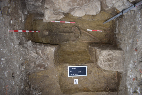 The archaeological research at Ruja highlighted in the 2021 campaign the existence of several levels of burials. In S9 we have early burials unrelated to the present chancel of the church. M11 is a choir-cut tomb, and M14 and M15 are tombs below the present chancel of the church. On the north side section S10 revealed two foundations. One of the foundations is made of hillstone (a kind of local sandstone) bonded with clay. In the section, the bend of this foundation was captured, the south side of which goes under the foundation of the present choir. The second foundation discovered is much better built, deeply cast and more than 1 m thick. The role of this foundation was to support a body of the church and not just a sacristy. The lengths of these two foundations remain to be investigated. In S11 a foundation of stone stuck with clay on the sole and mortar on top emerged. This is part of the foundation of the present buttress and does not appear to be woven with the present foundation of the chancel, but the information is not clear. Both late, N-S oriented and early graves emerged. The oldest, however, is M27, a tomb with a cephalic niche and a step, with the pit dug in yellow earth, ritualistic burial features found in the settlers of the 12th-13th centuries.