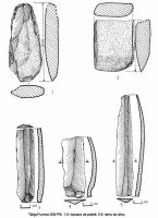Uneltele de piatră şlefuită sunt mai puţine, majoritatea fiind fragmentare. Pentru realizarea lor, cel mai frecvent s-a folosit marna bituminoasă, dar întâlnim şi piese de gresie. Ca tipuri, întâlnim topoare trapezoidale neperforate, tesle, precum şi eboşe în diferite stadii de prelucrare.