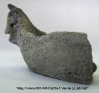 Cea mai remarcabilă descoperire ceramică o reprezintă două fragmente, realizate dintr-o pastă amestecată cu cioburi pisate, tipică pentru cultura Precucuteni, provenind, probabil, de la o piesă de tip "bărcuţă". Chiar dacă, până în prezent, nu s-a reuşit reconstituirea globală, piesa pare a avea forma unei tipsii ovale, cu fundul drept şi marginea, cu o înălţime cuprinsă între 2,8 şi 3,2 cm, uşor adusă spre interior. Unul dintre fragmente, "prova", are aplicată, la partea superioară a marginii, o protomă de bovideu, foarte realist tratată (din păcate, un corn nu se mai păstrează). La celălalt fragment, "pupa", marginea, de asemenea supraînălţată, prezintă două vârfuri rotunjite, ca un fel de corniţe.