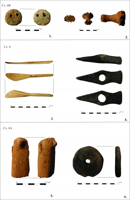 2. Orizontul epocii cuprului, reprezentat de un sigur artefact rulat, un topor de tip Jászladány, artefact asociabil cu culturile Tiszapolgár și Bodrogkeresztúr. În această fază a cercetării însă nu poate fi legată de nici un complex săpat în cadrul sitului, prin urmare, ca ipoteză de lucru putem formula posibilitatea ca acest topor să fi ajuns acolo prin schimb și/sau comerț, și rămas în uz pentru o perioadă mai lungă de timp;